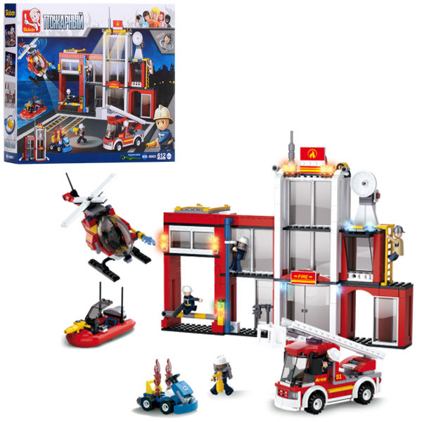 Конструктор Пожежний на 612 деталей. З набору можна самостійно зібрати пожежну частину, пожежний транспорт - машини, вертоліт. І звичайно ж в набір входять ігрові фігурки з аксесуарами.